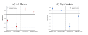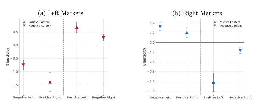 Los resultados muestran que las preferencias de los espectadores cambian significativamente entre ambos periodos. Cuando comienza la campaña, la demanda de información se polariza aún más. La Figura 4 ilustra este resultado mostrando la elasticidad de la demanda para cada tipo de contenido en comunidades autónomas de izquierdas (panel izquierdo) y de derechas (panel derecho). Los espectadores demandan contenido positivo para su partido y penalizan el favorable al bloque contrario. Este último efecto, la aversión al grupo opuesto, es el que domina, en línea con el fenómeno de polarización afectiva, donde lo que prima es el rechazo al adversario más que el apoyo al propio grupo.