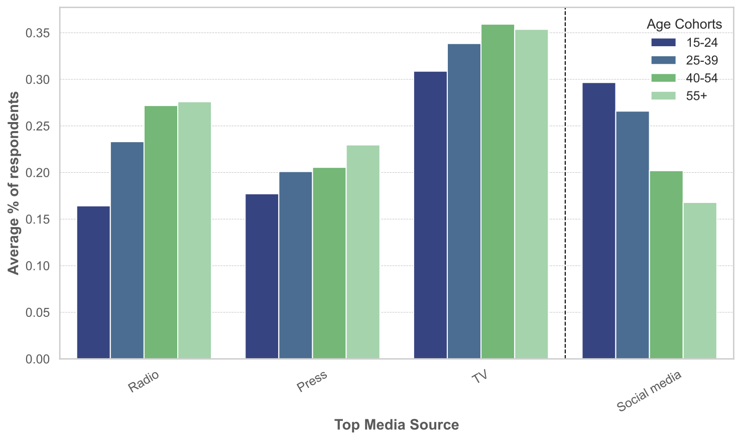 A pesar de la popularidad de las redes sociales, la televisión sigue desempeñando un papel central para el acceso a la información política. Así lo muestra el siguiente gráfico, elaborado a partir de datos del Eurobarómetro 2022, que recoge la media de las respuestas a la pregunta “¿Cuál es su medio preferido para adquirir información política?” para todos los países de la Unión Europea. La televisión es el medio preferido en todos los grupos de edad, por encima incluso de las redes sociales.
