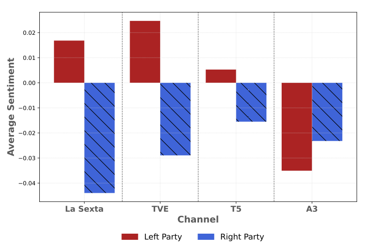 La Figura 2 muestra el resultado de este índice para los principales canales, agrupando los partidos en un bloque de izquierdas (PSOE y SUMAR) y otro de derechas (PP y VOX). Valores positivos indican un tono favorable hacia cada partido y viceversa. La Sexta aparece como el canal más afín a la izquierda, seguida de TVE, Telecinco y Antena 3, que se sitúa como el canal más cercano a la derecha. Para consultar más detalles sobre la clasificación y resultados, invito al lector a consultar nuestro proyecto Spanish Media Monitor, donde recopilamos y actualizamos estos datos y ofrecemos herramientas interactivas para comparar la cobertura política de los canales, seguir la evolución del sesgo en el tiempo y ver qué eventos generan más acuerdo o desacuerdo entre cadenas.
