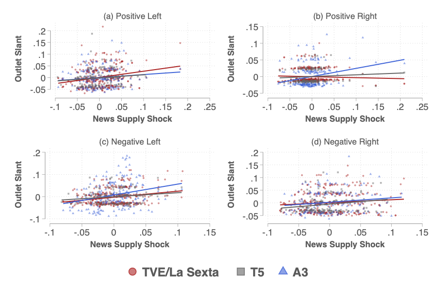Para identificar la demanda, utilizo shocks de oferta. En concreto, aprovecho el hecho de que los canales de televisión (y los medios tradicionales en general) contratan con agencias de noticias para obtener información sobre todos los eventos del día y en base a esto deciden su cobertura. Para capturar este proceso, recopilo más de 32.000 noticias de Agencia EFE y las clasifico según el tono y el partido al que se refieren, aplicando la misma metodología. Así construyo el panorama diario de la información política disponible, lo que me permite estimar cómo los canales ajustan su cobertura ante cambios exógenos en la actualidad política. La Figura 3 nos muestra cómo cambia el tiempo de cobertura en cada canal (eje y) cuando hay mayor abundancia de noticias positivas o negativas de un partido en particular (eje x).