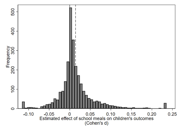 Una vez corregido el sesgo de publicación (muy bajo en esta literatura) y las diferencias entre estudios, el efecto medio (0,014 desviaciones estándar) se reduce prácticamente a cero, por lo que concluimos que el impacto de los programas de comedor escolar en las dimensiones analizadas es prácticamente nulo en países desarrollados. Sin embargo, encontramos que aquellos que proveen desayuno escolar y los que conceden becas comedor en función de los ingresos familiares presentan los efectos más positivos.