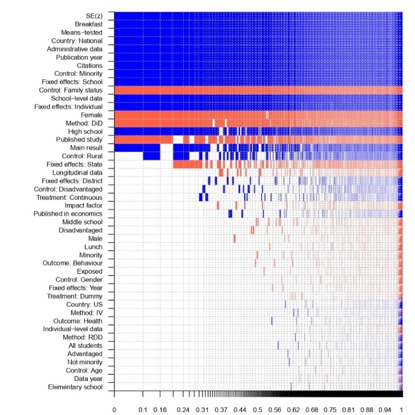 Para corregir el sesgo de publicación, utilizamos distintos métodos empleados en los metaanálisis más recientes. En cuanto a la heterogeneidad, recopilamos 59 variables que reflejan el contexto en que se obtuvo cada estimación, incluyendo, entre otras, las características de los programas, los estudiantes analizados, los datos y los métodos utilizados. En la Figura 2 mostramos el impacto de estas características sobre las estimaciones reportadas en la literatura. El color azul indica un impacto positivo de la variable, mientras que el color rojo denota un efecto negativo.