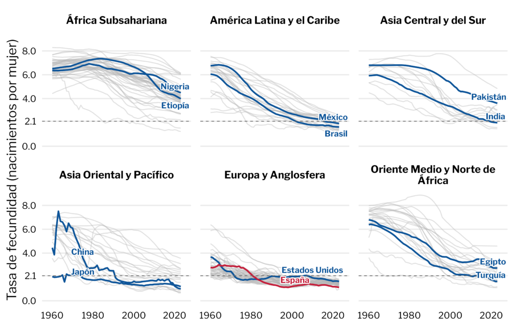 El mundo está viviendo un cambio demográfico sin precedentes. La fecundidad global ha caído de alrededor de 5 hijos por mujer en la década de los cincuenta a unos 2,25 en 2023, apenas por encima de la tasa de reemplazo de 2,1 hijos por mujer necesaria para mantener estable el tamaño de la población (Figura 1). Como resultado, más de dos tercios de la humanidad vive ya en países donde la fecundidad ha caído por debajo de este umbral. Para más inri, cálculos alternativos basados en registros administrativos sugieren que las tasas de fecundidad estimadas en los World Population Prospects de Naciones Unidas (la fuente de referencia más utilizada para datos demográficos globales) podrían estar sobreestimadas y apuntan a que el mundo podría encontrarse ya por debajo del nivel de reemplazo.
