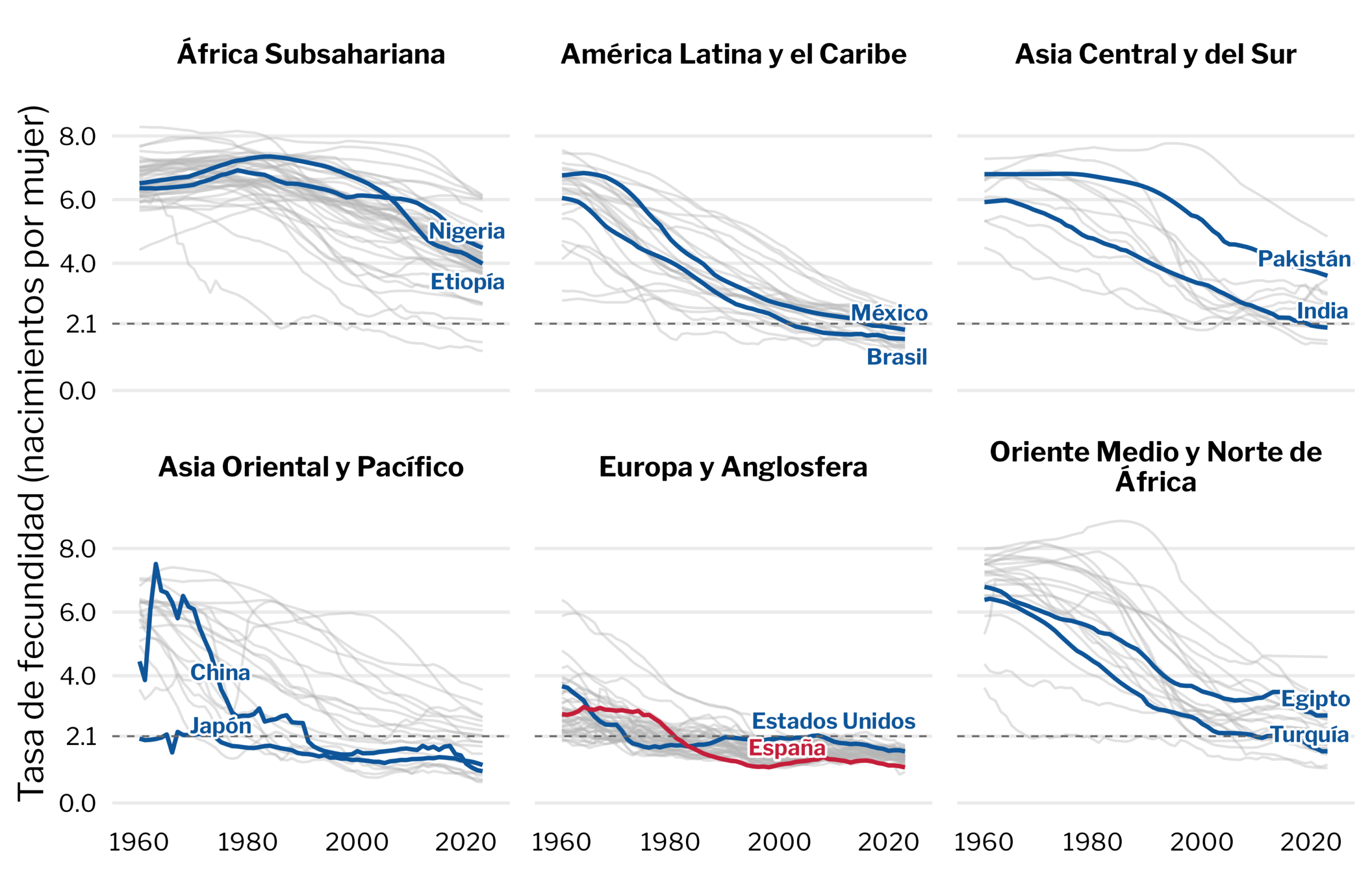 Figura 1: Las tasas de fecundidad han caído en todo el mundo, y la mayoría de economías están ya por debajo o cerca del nivel de reemplazo