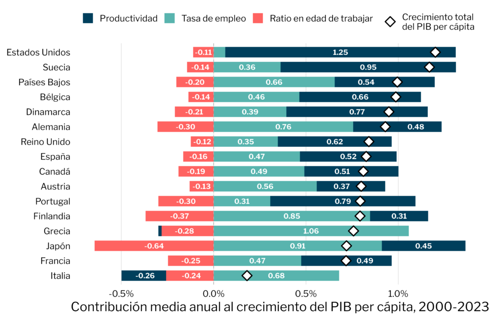 Japón ofrece un adelanto de este futuro. Se han escrito ríos de tinta sobre las "décadas perdidas" del país nipón, atribuyendo su estancamiento económico a una combinación de crisis bancarias mal gestionadas y fallos de política monetaria. Sin embargo, cuando uno controla adecuadamente por el factor demográfico, el desempeño económico de Japón no resulta peor que el de otras economías avanzadas: su crecimiento del PIB por ocupado desde los años 2000 ha sido similar al de Alemania, Francia o la misma España. La principal diferencia es que el tamaño relativo de su población en edad de trabajar ha caído en picado desde la década de los noventa.
