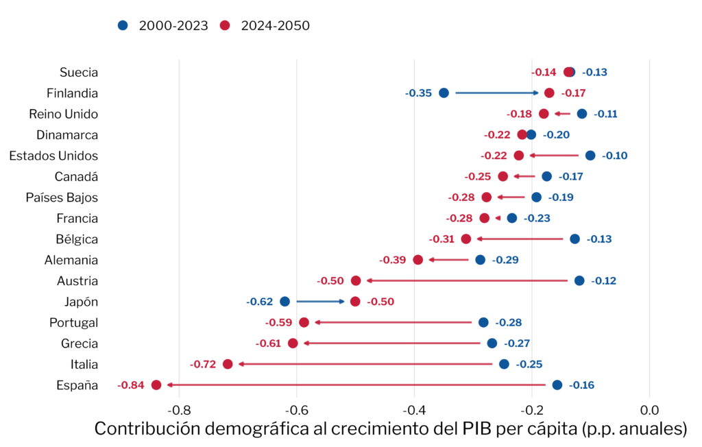 Los resultados sugieren que España será una de las economías avanzadas más afectadas en las próximas décadas (Figura 3). Entre 2000 y 2023, el factor demográfico restó en promedio 0,16 puntos porcentuales anuales al crecimiento del PIB per cápita español – una contribución negativa pero modesta. Sin embargo, entre 2024 y 2050, este lastre se multiplicará por cinco hasta alcanzar aproximadamente 0,84 puntos porcentuales anuales. Teniendo en cuenta que el crecimiento medio anual del PIB per cápita español en las últimas dos décadas ha sido del orden del 0,8% anual, la materialización de este lastre demográfico adicional (de 0,68 puntos porcentuales) sobre la misma base de crecimiento histórico reduciría el crecimiento del ingreso por persona a apenas una décima porcentual anual.