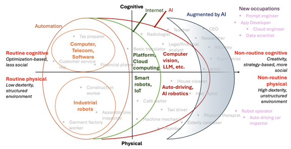 - El Internet y, más recientemente, la IA han hecho posible que las máquinas y algoritmos realicen tareas cognitivas no rutinarias más complejas, afectando así los trabajos de los analistas financieros, evaluadores de riesgo y los traductores (cuadrante superior-derecho).