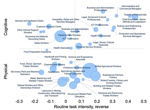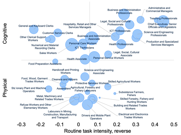 La Figura 2 (paneles A y B) operacionaliza este marco estilizado con indicadores de la intensidad (preponderancia) de los distintos tipos de tareas en las ocupaciones y datos de la estructura ocupacional de economías emergentes y avanzadas. En economías de altos ingresos, la mayor parte del empleo se concentra en trabajos con una alta intensidad en tareas de índole cognitiva y no rutinarias (reflejando la preponderancia del sector servicios en la economía). Los trabajos cuyas tareas son predominantemente rutinarias y manuales — tales como los operarios de máquinas o el personal administrativo — ya han experimentado una automatización significativa. Los países de bajos ingresos aún tienen una alta proporción de trabajadores en la agricultura y en trabajos manuales rutinarios. Los países de ingresos medios se encuentran en un punto intermedio — más allá de la agricultura, estos tienden a tener una mayor proporción de trabajos manuales rutinarios y de trabajos cognitivos rutinarios que los países ricos o los países pobres. Estos son los empleos más vulnerables a la automatización.