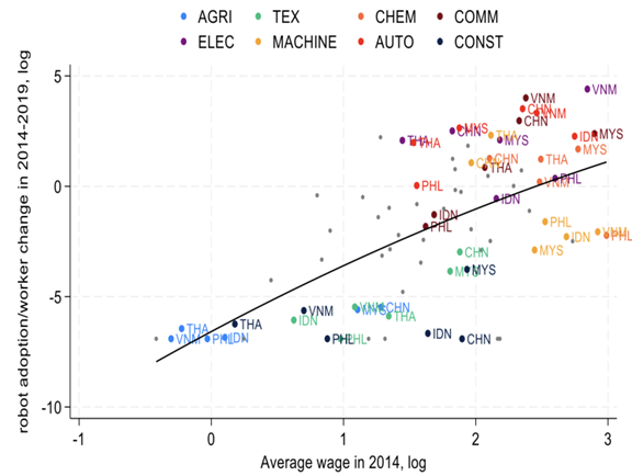 El costo y la rentabilidad económica de los robots varían entre industrias y países. Las nuevas tecnologías son más rentables económicamente en sectores donde los salarios son más elevados. Nuestra evidencia para un grupo de los países del este asiático muestra que los robots utilizados en el sector automotriz cuestan aproximadamente 10 veces más que aquellos utilizados en sectores donde los salarios son más bajos como las industrias de caucho y plásticos. Así, en Indonesia y Filipinas, los robots se utilizan principalmente en las industrias de caucho y plásticos, mientras que en China, Malasia y Tailandia la adopción de robots se extiende a los sectores de electrónica y automóvil (ver la Figura 3).