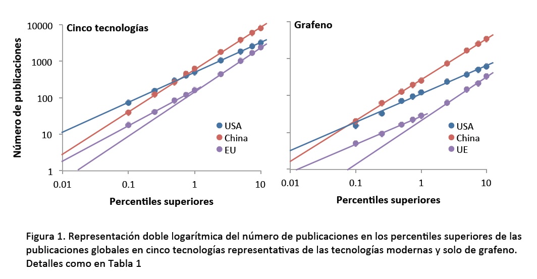 La Tabla 1 resume los resultados de las publicaciones en el descrito 0.01% superior y en los percentiles inmediatos del 0.1% y 1.0% para EEUU, China y la UE. Con más detalle, en la Figura 1 se consideran nueve percentiles, de 0,1% a 10%, y se utiliza una representación doble logarítmica, porque la función que relaciona los dos parámetros representados es una ley de potencias. La figura incluye una representación específica para grafeno, porque pone mejor de manifiesto los problemas de la investigación en la UE. En estas figuras, la eficiencia de los sistemas de investigación se puede medir por la pendiente de las rectas, que es función del exponente de las leyes de potencia.