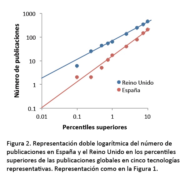 Para mostrar la situación de España se puede hacer una comparación con el Reino Unido, que tiene un nivel científico similar al de los Países Bajos, pero un tamaño más parecido al de España. La Figura 2 es equivalente a la Figura 1 pero solo para España y Reino Unido. Aunque esta figura no tiene un número de publicaciones suficientes para un ajuste robusto (los percentiles con menos de 10 publicaciones es mejor no considerarlos), lo que se deduce es que el Reino Unido tiene unas 15 veces más peso que España en el percentil 0.01% superior. En otras palabras, con la eficiencia actual, España tendría que multiplicar por 15 su inversión en investigación para tener el éxito del Reino Unido.