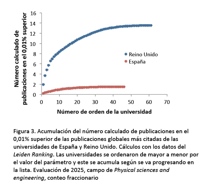 Una alternativa metodológica completamente diferente para hacer la comparación de la Figura 2 es utilizar los datos de publicaciones por percentil recogidos en el Leiden Ranking (1%, 5%, 10% y 50%) para calcular el percentil 0.01. El método es solo una aproximación al nivel disruptivo ya que el conteo de citas en el Leiden Ranking se hace en un periodo demasiado próximo a la publicación, lo que subvalora las publicaciones disruptivas. Si consideramos las 40 universidades más productivas (la Figura 3 es una representación acumulativa), el Reino Unido es nueve veces más productivo, lo que, como he dicho, subvalora la diferencia en el nivel disruptivo. Llama la atención que solo la primera universidad, la de Oxford, aporte más que todas las universidades españolas.