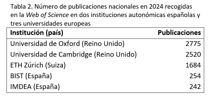 Pero en investigación disruptiva el éxito tiene una frecuencia extremadamente y, junto a la eficiencia, el tamaño cuenta, por eso, hay que organizarla a nivel nacional y de la UE. La Tabla 2 compara las publicaciones del BIST y el IMDEA con tres universidades europeas con investigación prestigiosa; es improbable —quizás imposible— que una institución autonómica en España pueda alcanzar la dimensión de estas universidades.