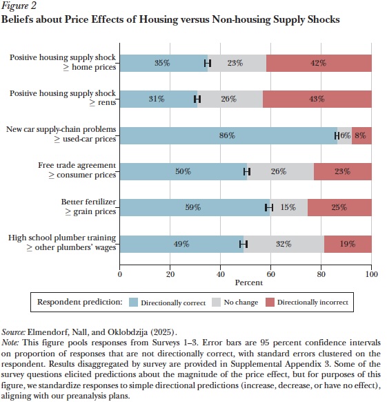 A modo de corolario, no se puede obviar el dilema central de economía política que todo esto encierra: hacerlo implica reducir el valor relativo de las que ya existen. Al menos respecto al contrafáctico, que es el mercado actual de escasez. En un país donde el 74% de la población es propietaria y alrededor del 80% de los activos son de tipo no financiero (vivienda en su mayoría), el conflicto es evidente. El “homevoter theorem”, formulado por William A. Fischel circa 2001 viene a postular que los propietarios tienden a votar y a presionar por políticas locales —de gasto público, fiscalidad y, sobre todo, regulación del suelo— que protejan y refuercen el valor de su vivienda. Aunque, la verdad, mi impresión sobre las reticencias está mejor capturada en un trabajo reciente que muestra mediante encuestas que la mayoría de la gente simplemente no cree que aumentar la oferta reduzca los precios, como se observa en la siguiente figura. La proporción de quienes sostienen eso es mucho mayor en el caso de la vivienda que en cualquier otro mercado. Esto iría más allá de los incentivos materiales para limitar la oferta, contemplando también posiciones de partida que harían difícil imaginar un equilibrio distinto.