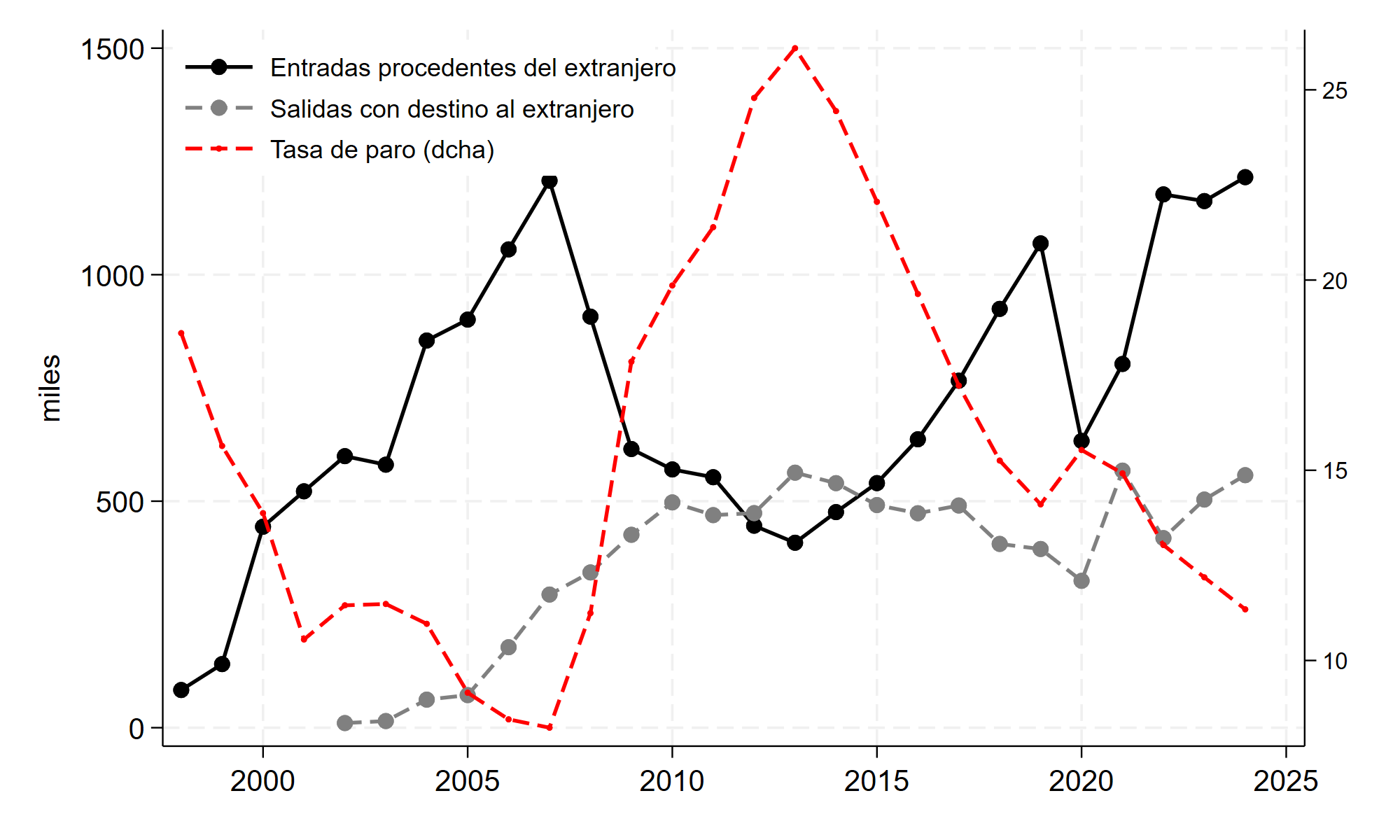 La Figura 1 muestra la evolución de las entradas y salidas de España de personas nacidas en el extranjero desde 1998 a 2025. Dos cosas destacan. Primero, el carácter procíclico de los flujos: las entradas presentan una clara correlación negativa con la tasa de paro; mientras que las salidas, aunque menos sensibles al ciclo, también responden a cambios en el mercado laboral (Özgüzel 2021; Gálvez-Iniesta 2024). Segundo, las magnitudes. En el pico del boom migratorio (2007), entraron en España en torno a 1,2 millones de personas nacidas en el extranjero. Esta cifra se ha vuelta a alcanzar no una, sino en los últimos tres años consecutivos, desde 2021.