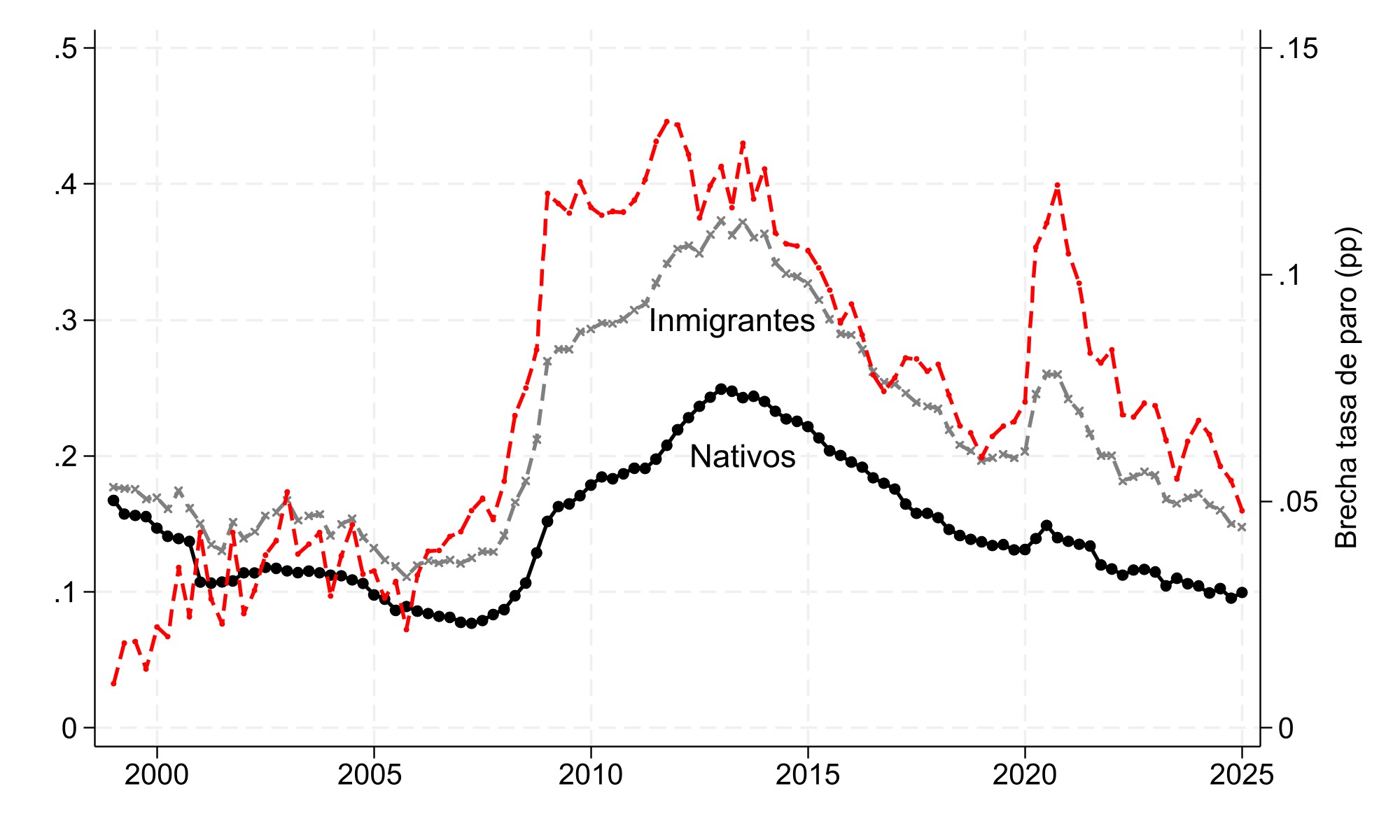 La Figura 2 muestra la evolución de las tasas de paro de inmigrantes y nativos, además de la diferencia entre ambas (brecha, en rojo). En los años previos a la Gran Recesión (2000-2006), la brecha era de apenas 3 puntos porcentuales. Pero durante la Gran Recesión las tasas de paro aumentaron de manera desproporcional. Entre 2008 y 2014, la tasa de paro inmigrante promedio alcanzó el 30% y el 18% para los nativos. Como resultado, la brecha se multiplicó por 4 , llegando a 12 puntos porcentuales.