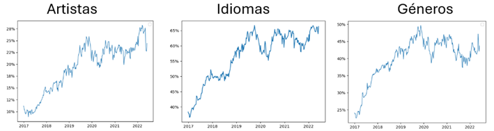 Entre 2016 y 2022, ver Gráfico 1, la presencia de artistas locales en las listas nacionales, panel izquierdo, se multiplicó por más de dos, pasando del 12% al 29% de las canciones más escuchadas. En términos de reproducciones, el peso de los artistas nacionales alcanzó el 30 % del total. Lo mismo ocurrió con los otros dos indicadores de “localidad”. Las canciones en idiomas nacionales, panel central, subieron del 44% al 65%. Los géneros musicales originarios del país (por ejemplo, el flamenco en España, el sertanejo en Brasil, el cuarteto en Argentina) aumentaron del 30% al 43%, panel derecho.