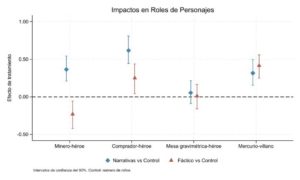 La Figura 3 muestra los efectos de los videos sobre las percepciones de los participantes. Tras la exposición, se pidió a los mineros que seleccionaranen adjetivos asociados a tres roles —héroe, víctima y villano— para describir a los mineros, a los compradores de oro, el mercurio y la mesa gravimétrica. Los resultados indican que el video narrativo aumentó significativamente la proporción de mineros que se percibíanen a sí mismos como héroes, mientras que el video factual reforzó el estereotipo de villano.
