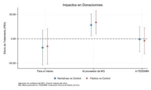 Para observar si los cambios en la percepción se traducían en decisiones reales, el estudio incorporó una lotería con premio monetario. Se preguntó a los mineros qué parte del premio hipotético donarían al proveedor de la mesa gravimétrica o a la asociación local de mineros. La Figura 4 muestra que, tras ver cualquiera de los dos videos, aumentó el apoyo económico al proveedor de tecnología limpia.