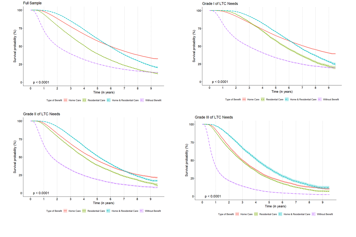 Figura 1 – Curvas de supervivencia de Kaplan-Meier para toda la población (arriba-izquierda), la población con Grado I de dependencia (arriba-derecha), Grado II (abajo-izquierda) y Grado III (abajo-derecha) en función del tipo de prestación recibida.