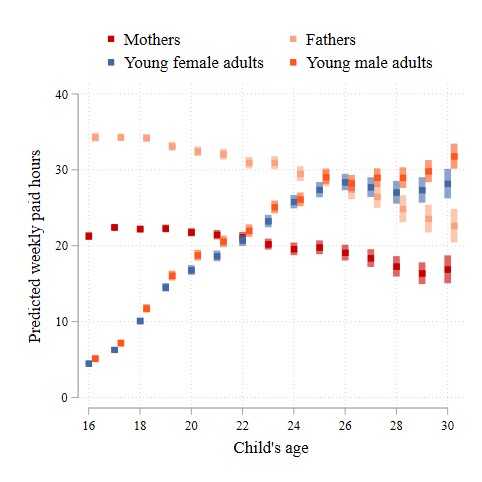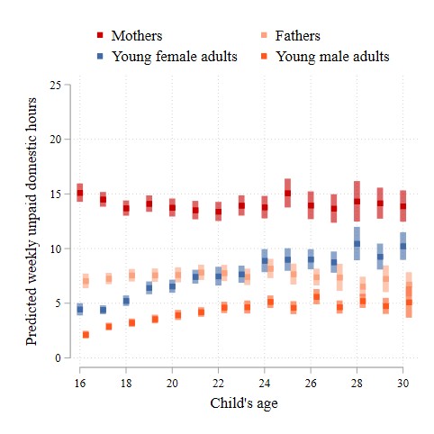 En mi artículo recientemente publicado en SERIEs (The Unchanging Divide: Housework and Labour Responsibilities in Late Family Stages), analizo precisamente esta pregunta utilizando datos longitudinales del Reino Unido, entre 1992 y 2023. El objetivo es entender cómo evoluciona la división del trabajo remunerado y doméstico entre madres y padres durante dos etapas clave: