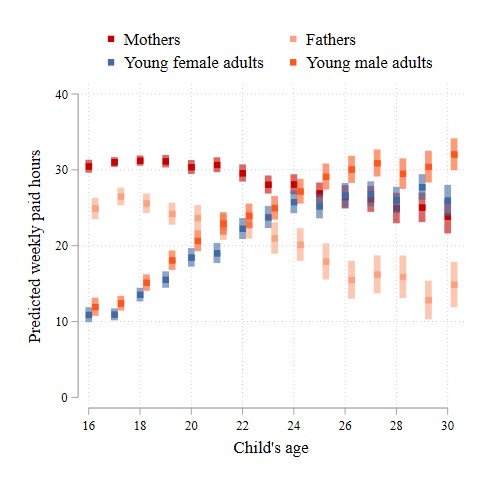 Entre los hijos también aparecen brechas: las hijas contribuyen algo más al trabajo doméstico y, a partir de los 21 años, alcanzan niveles similares a los de los padres, mientras que los hijos varones apenas superan las 4–5 horas semanales. En cambio, en trabajo remunerado las trayectorias de chicos y chicas son muy parecidas.