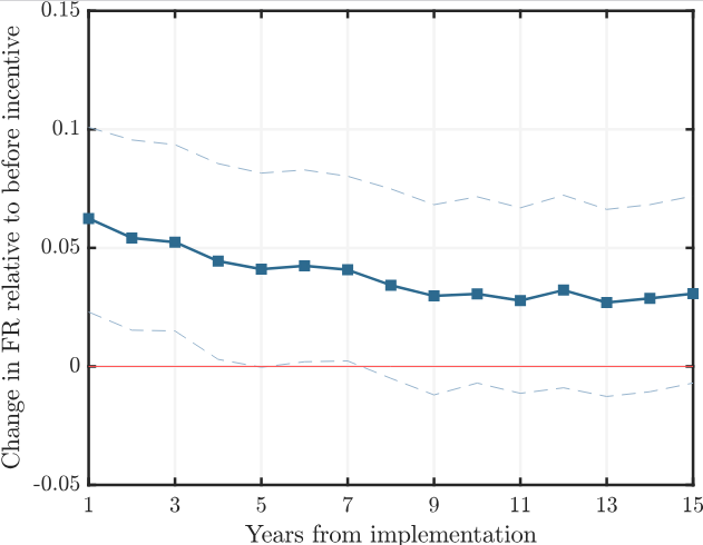 En otras palabras, el impacto a largo plazo es solo la mitad del impacto observado a corto plazo. Esto ocurre porque las mujeres reaccionan de forma distinta según su edad cuando se introduce la política. Las mujeres jóvenes tienen más margen para reorganizar el calendario de nacimientos, mientras que las mujeres de mayor edad están más limitadas biológicamente y concentran su respuesta en los años inmediatamente posteriores a la introducción de la ayuda.
