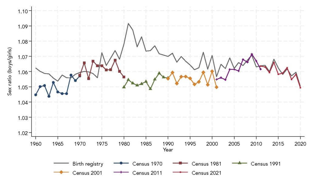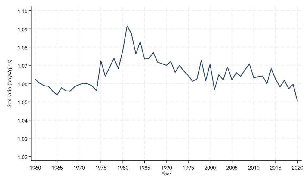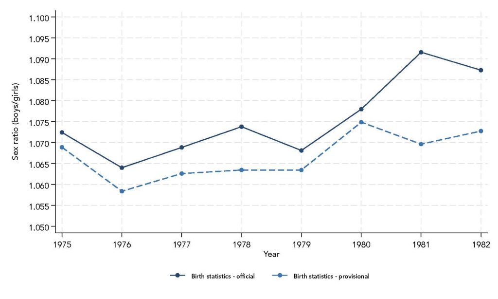 En un contexto en el que parece descartable la existencia de abortos selectivos, para explicar esta anomalía en la literatura académica se han propuesto factores como cambios en la edad materna, el orden de nacimiento y la intensidad de la radiación solar. Sin embargo, la evidencia acumulada en otros países sugiere que estos factores, en caso de que importasen, solo podrían explicar variaciones muy pequeñas en la proporción de niños por niña, difícilmente por encima de los 107 niños por cada 100 niñas. Más recientemente, se ha planteado que la introducción de técnicas de detección del sexo fetal en los años ochenta permitió a las madres conocer el sexo del feto con antelación, y aquellas que esperaban una niña habrían sido menos cuidadosas durante la gestación, aumentando la supervivencia masculina en detrimento de los fetos femeninos. Sin embargo, la plausibilidad biológica de este mecanismo también es limitada. El sexo fetal no podía determinarse de forma fiable por ecografía hasta al menos las 12 semanas de gestación, y apenas el 1-5% de los embarazos terminan en aborto espontáneo a partir de ese momento. Incluso bajo los supuestos más extremos sobre diferencias en los cuidados prenatales, unas tasas de pérdida fetal tan bajas no bastarían para generar una desviación de 3 puntos porcentuales respecto a la proporción biológicamente esperada.