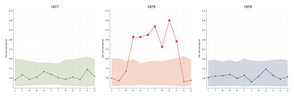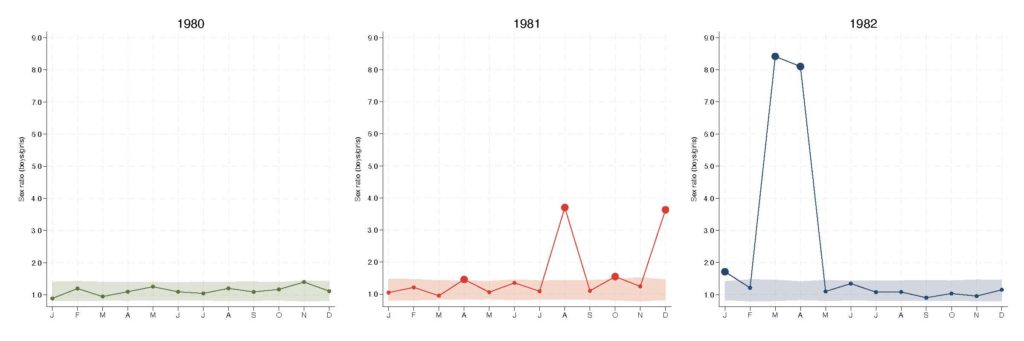 Como muestra la Figura 2, la proporción de niños por niña en los datos oficiales del INE experimentó un brusco aumento a partir de 1975, alcanzando su pico en 1981, y después disminuyó gradualmente hasta retornar a los niveles esperados hacia el año 2000.