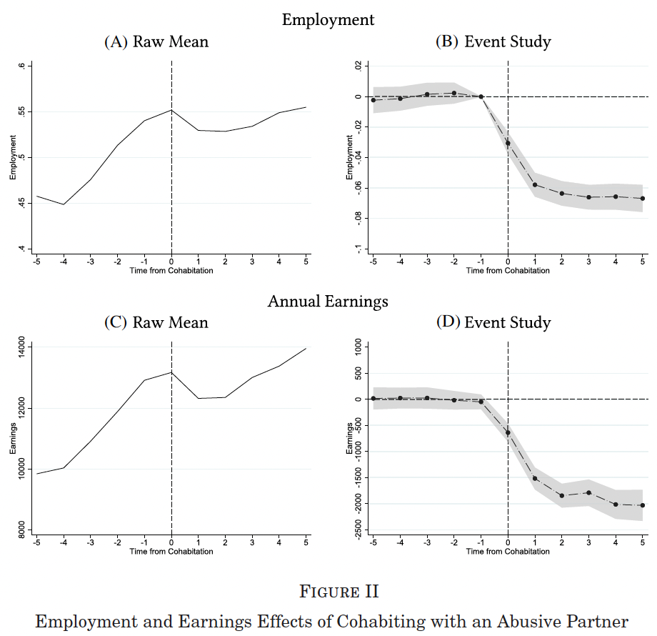 Las autoras encuentran que antes del año 0 (momento del inicio de la convivencia) las tendencias entre víctimas y controles son similares, y que después aparece una divergencia persistente. En particular, como se puede ver en los gráficos B y D más abajo, encuentran que, justo después de comenzar la convivencia, las mujeres en relaciones abusivas tienen 6,7 puntos porcentuales menos de empleo que sus controles y esa brecha persiste al menos cinco años. En ingresos, pierden de media 1.600 € al año durante los cinco años posteriores, alrededor de un 12% respecto a sus ingresos del año anterior a convivir. La clave no es solo el tamaño, sino la dinámica. No parece que estas mujeres “ya fueran peor” y por eso acabaran en una relación violenta; el quiebre aparece con la convivencia.