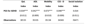 Los resultados son claros y consistentes. Los adultos mayores con una mayor predisposición genética al TDAH presentan peor calidad de vida, más limitaciones físicas, mayores dificultades de movilidad y niveles más elevados de depresión. Para dar una idea de las magnitudes: un aumento de una desviación estándar en la predisposición genética al TDAH se asocia con un incremento del 11,3% en el índice de limitaciones funcionales y del 9,6% en el índice de dificultades de movilidad. En cambio, no encontramos una asociación estadísticamente significativa con el aislamiento social.