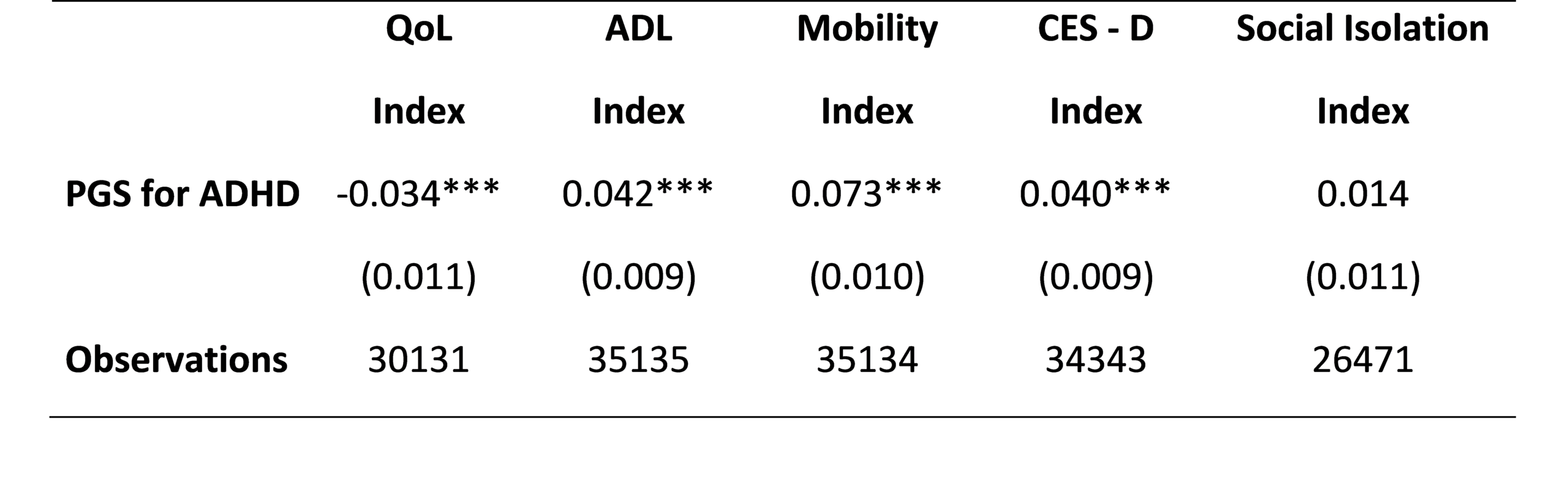 Analizamos cinco indicadores de salud y bienestar: calidad de vida (medida por el índice CASP-19), limitaciones funcionales (índice ADL), dificultades de movilidad, depresión mayor (escala CES-D-8) y aislamiento social (escala UCLA de soledad). Nuestra estrategia empírica se basa en el modelo de Grossman de producción de salud, estimando por mínimos cuadrados ordinarios la asociación entre el PGS para TDAH y los resultados de salud, controlando por un amplio conjunto de covariables sociodemográficas, componentes principales genéticos (para controlar la estratificación poblacional), y efectos fijos de tiempo y región.