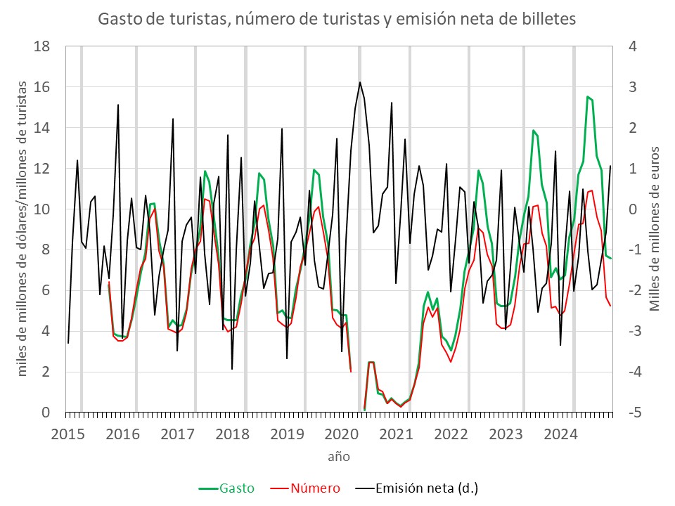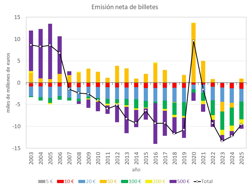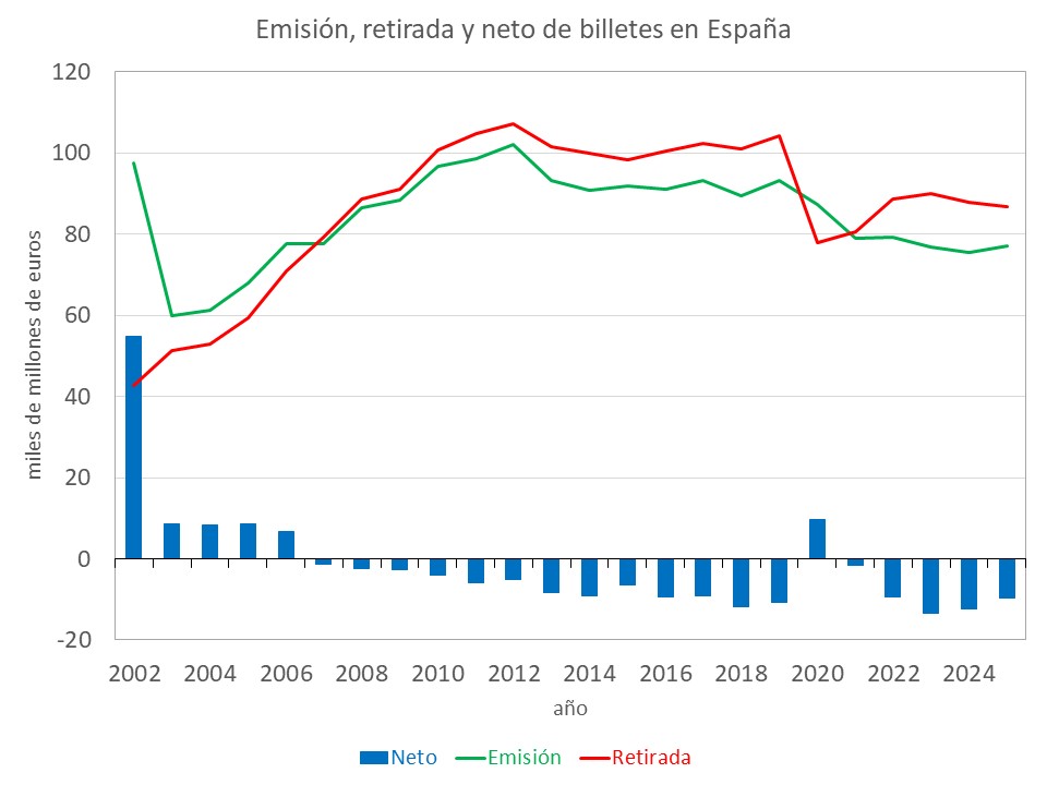 Según el último informe institucional del Banco de España, correspondiente al año 2024, en nuestro país se retiraron de la circulación en ese año más billetes y por más valor que los que se distribuyeron (ver página 122 del informe). En particular, durante 2024, el "Banco de España entregó 2.489 millones de billetes a las entidades de crédito por un valor total de 75.788 millones de euros". Durante ese año, "se retiraron 2.871 millones de billetes por un valor de 88.037 millones de euros. (...) La diferencia entre los billetes entregados y recibidos resultó en una emisión neta negativa de 382 millones de billetes, equivalentes a 12.249 millones de euros". Nuestro banco central concluye seguidamente que "esta cifra negativa se debe a la importancia del sector turístico en España, más concretamente al efectivo en euros que portan los turistas, procedente de sus países de origen".