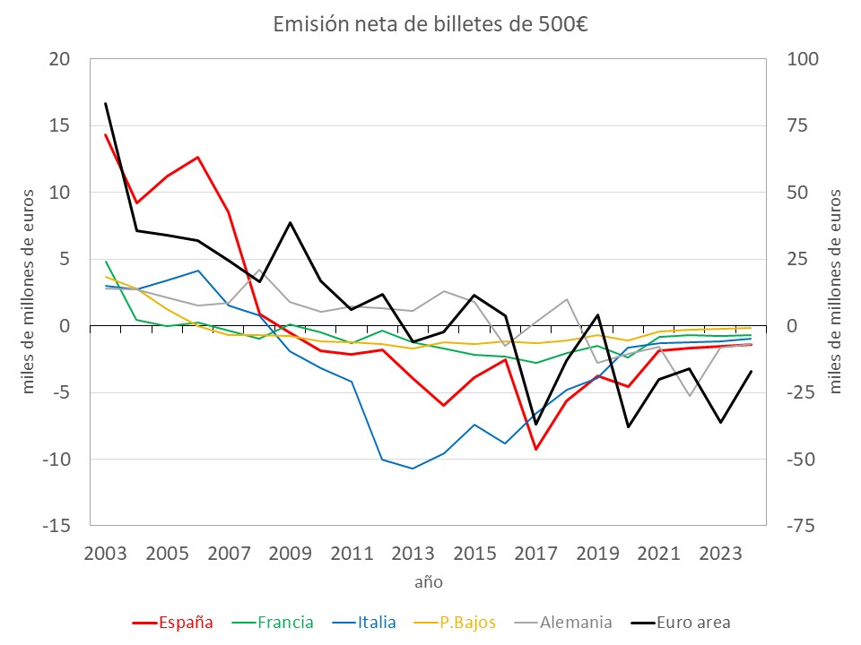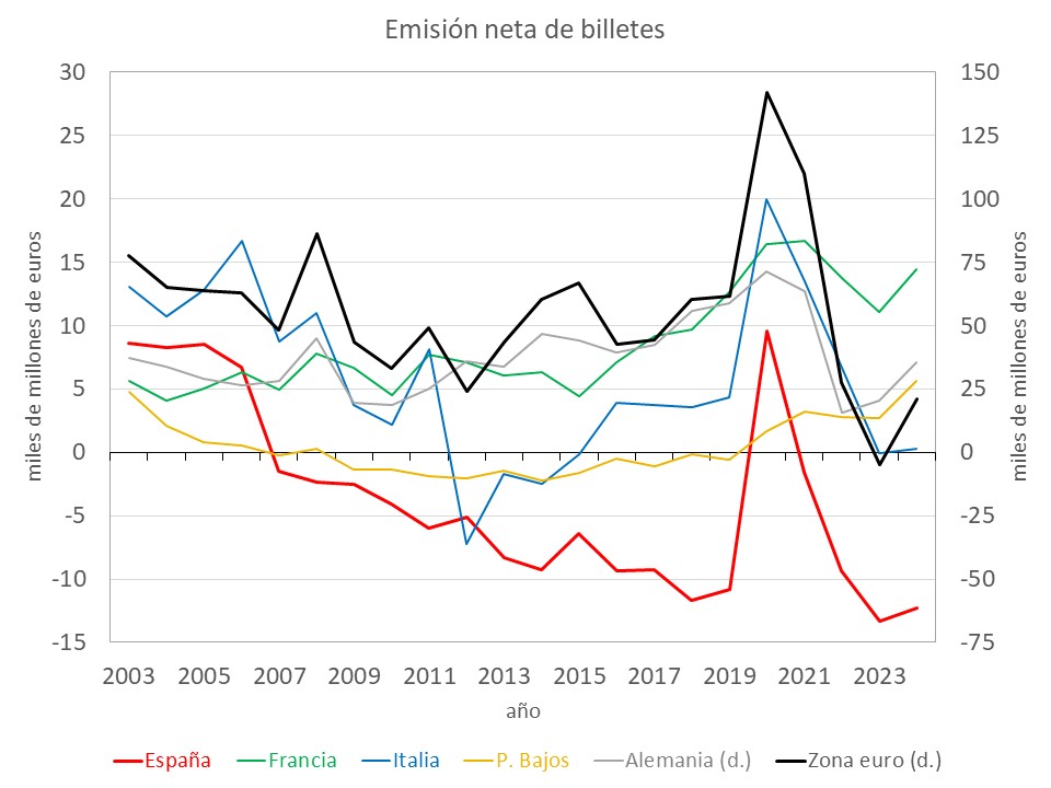 El siguiente gráfico compara la emisión neta de España con los otros cuatro países grandes de la zona euro (Alemania, Francia, Italia y Países Bajos) así como con la Zona euro en general. Los datos de Alemania y la Zona euro se miden en el eje vertical de la derecha. Las series son anuales, acaban en 2024 y comienzan en 2003 para evitar la masiva emisión inicial de 2002. Vemos cómo “Spain is different”. Es el país con la mayor y más prolongada emisión neta negativa de los últimos 17 años. Según estos datos, nos hemos convertido en el cementerio de billetes de la zona euro; en el Blade runner monetario dedicado a retirarlos de la circulación.