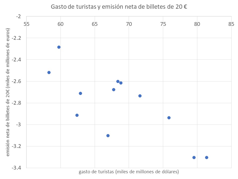 Si en vez de billetes de 20€, usamos billetes de 500€, otro importante componente de la emisión neta total, la relación, aun siendo negativa, es mucho más débil, con una correlación de -0.33. Es lógico pensar que la relación tan estrecha entre denominaciones de billetes más bajas y el gasto del turismo se debe a que estas denominaciones suelen ser las más usadas por los consumidores cuando viajan. Esta relación es más difícil de entender para denominaciones más altas, como la de 500€ ya que es razonable pensar que los turistas no viajan con esos billetes en el bolsillo.