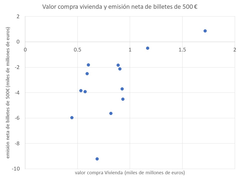 Como se observa, hay una fuerte relación positiva entre la emisión neta de billetes de 500€ y el estimador del valor de compra de viviendas con una correlación positiva del 0.60. Como comparación, la correlación del indicador del valor de compra de viviendas con la emisión neta de billetes de 20€ es solo de 0.21.