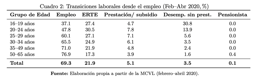 En el agregado, entorno a un 69% de los ocupados en febrero de 2020 mantuvo su empleo en abril, un 22% pasó a estar cubierto por un ERTE y un 5% accedió a una prestación. Entre los menores de 20 años, sólo el 37% mantuvo el empleo y casi un 31% perdió su trabajo sin cobertura; entre los mayores de 50, la continuidad superó el 76%. Las diferencias responden principalmente a la composición contractual: los jóvenes se concentraban en empleos temporales, de corta duración y alta rotación.