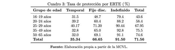 En apariencia, los trabajadores jóvenes estuvieron menos protegidos. No obstante, una vez se realizan estimaciones logit para la probabilidad de protección por ERTE y se controla por tipo de contrato, antigüedad y factores individuales, las diferencias por edad se reducen sustancialmente. Los jóvenes no solo no estuvieron menos protegidos, sino que mostraron una mayor probabilidad relativa de acceder a un ERTE respecto a otros grupos, a igualdad de condiciones.