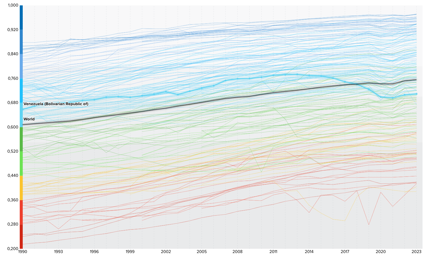 Otro indicador de interés, que en buena medida agrupa los anteriores y correlaciona con estos, es el índice de desarrollo humano. Este incluye tres dimensiones (vida saludable, conocimiento y estándar de vida) que agrupa indicadores como esperanza de vida al nacer, años de educación esperados, o el PNB per cápita en PPP (Paridad del poder adquisitivo), entre otros. La figura siguiente muestra el indicador para todos los países del mundo desde 1990, resaltando la media mundial y Venezuela.
