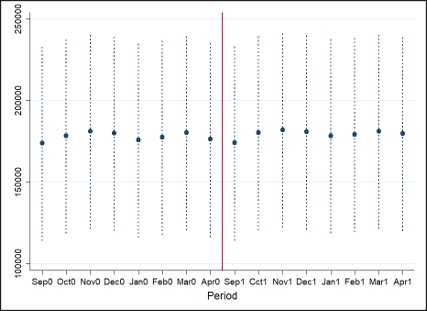 Los resultados, que cumplen la hipótesis de tendencias paralelas y son robustos a varios tests, se resumen en la figura siguiente, y en dos palabras: ningún efecto. La diferencia entre las ciudades afectadas por el ascenso y las no afectadas no varía en la temporada del ascenso, respecto a la diferencia preexistente entre ambos grupos.
