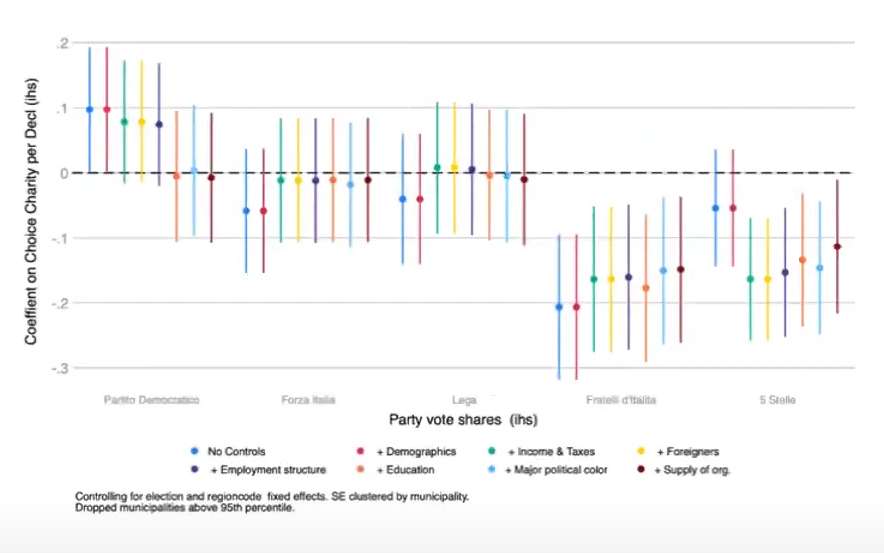 Los autores analizaron los datos fiscales administrativos de donaciones benéficas y a partidos políticos. Los resultados muestran que, en municipios con mayor proporción de estas últimas, la relación negativa entre voto de extrema derecha y donaciones a ONGs es significativamente más fuerte. Es decir: las donaciones políticas y benéficas actúan como sustitutos para los votantes de extrema derecha, un patrón que no se observa con la misma intensidad en votantes de otros partidos. No es que estos votantes estén en contra de hacer donaciones, sino que cambian a quién se las hacen.